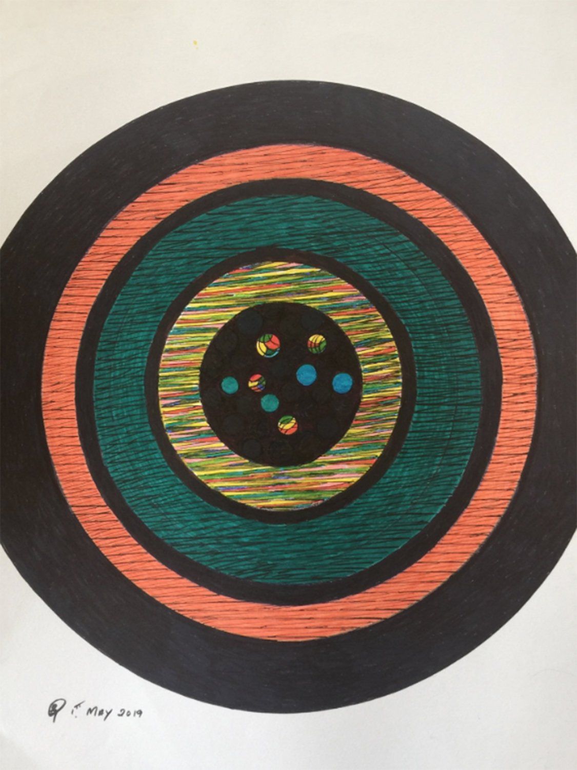 The colourful sphere's are an intrepretation of energy orbs; like lifeforce itself pulsating through small windows in the fabric of reality. Monochrome / coloured arcs act as enforcers of movement to carry the viewers eye around the work.